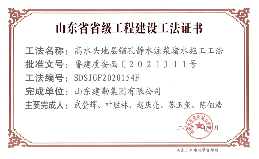 一、省级工程建设工法。为克服传统的锚孔突水注浆堵水工艺不足,集团公司结合汇中大厦项目基坑支护工程现场实践经验进行了提炼创新,总结出了一种高水头地层锚孔静水注浆堵水施工工法,经省住房城乡建设厅组织评价,被确定为山东省省级工程建设工法。