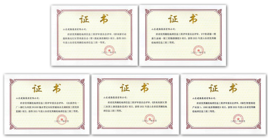 二、省级优秀测绘地理信息工程。山东省测绘地理信息行业协会发布的“2021年全省优秀测绘地理信息工程奖评选结果公示”中,集团公司参与申报的5个测绘地理信息项目质量、技术优良,顺利通过评选。其中,济南新旧动能转换先行区管理委员会(筹)摸底调查测绘项目获得2021年山东省优秀测绘地理信息工程一等奖;水质净化一厂~柳行头河段 DN1000 输水管定向钻穿越南水北调暗渠工程变形监测等四个项目获得三等奖。
